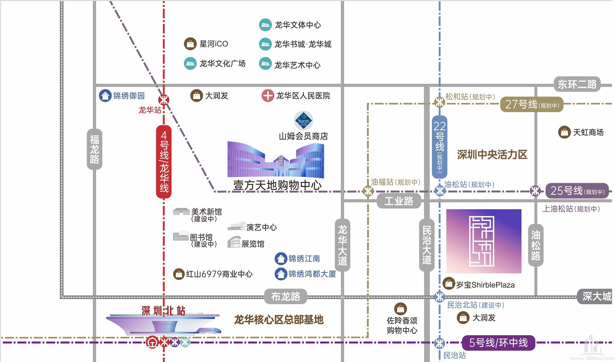 4/5/6/10号线已通车,22/25/27号线(规划中)交汇于龙华油松片区,畅达深圳北站、福田CBD、后海中心区