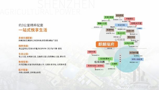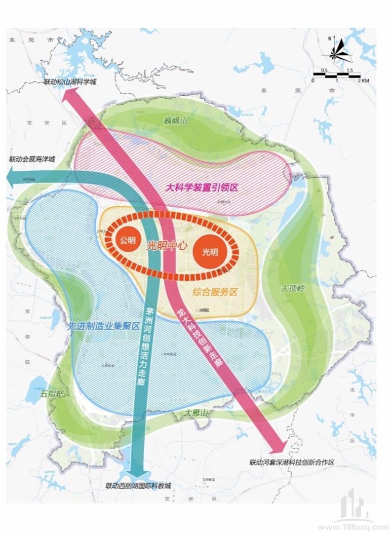 四园一河环伺,龟山公园、尖岗湖公园、五指耙公园、麒麟山公园及茅洲河,光明科学城公园
